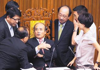 臺灣“立法院”上午舉行全院委員談話會,食品衛生管理條例、證所稅、“NCC”委員人事同意權等具爭議提案將會審理,臺“立法院長”王金平(中)利用機會在主席臺上,與國民黨政策會執行長林鴻池(右二)、民進黨“立院”黨團總召柯建銘(右三)等人,進行短暫協商。(來源:臺灣《聯合晚報》)