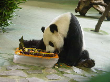 今年也不例外,等待小兩口的是蛋糕大餐,“圓圓”的蛋糕上鋪滿了餅干屑以及它十分愛吃的蘋果、紅蘿卜、葡萄、西瓜等,“團團”的蛋糕冰塊上則是鋪上了紅蘿卜絲,水果比“圓圓”的多了甘蔗。(中國臺灣網 李帥)