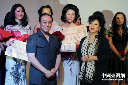 中國(guó)民族貿(mào)易促進(jìn)會(huì)執(zhí)行會(huì)長(zhǎng)劉延寧與臺(tái)灣的著名音樂(lè)人左宏元(古月)先生為冠軍潘帆頒獎(jiǎng)。(中國(guó)臺(tái)灣網(wǎng) 吳怡 攝)