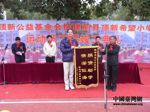 頂新希望小學(xué)王學(xué)文校長代表全校師生向頂新基金會回贈了感謝錦旗,上書“捐資助學(xué) 情深似海” (中國臺灣網(wǎng)記者 蕪?fù)瑪z)