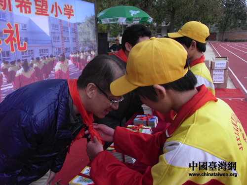 在新落成的運(yùn)動(dòng)場上,學(xué)校的小朋友為頂新公益基金會理事長騰鴻年戴上了紅領(lǐng)巾(中國臺灣網(wǎng)記者 蕪?fù)瑪z)