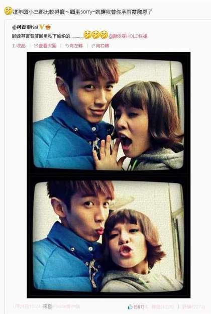 24日柯震東就曾在微博發了和Hold住姐正常版的合照,不過25日柯震東又發了和郭采潔的親密合照,讓Hold住姐感嘆和柯震東“果然只是露水姻緣”,因此發搞笑扮丑照報復他。(中國臺灣網 焦源源)