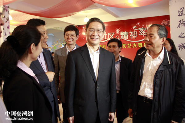 17日下午,在昆山調(diào)研察的中臺辦、國臺辦主任張志軍走進(jìn)普通居民區(qū),探望在此居住臺胞的生活情況,圖為張志軍在社區(qū)工作人員陪同下參觀居民活動室。(中國臺灣網(wǎng) 楊麗 攝)