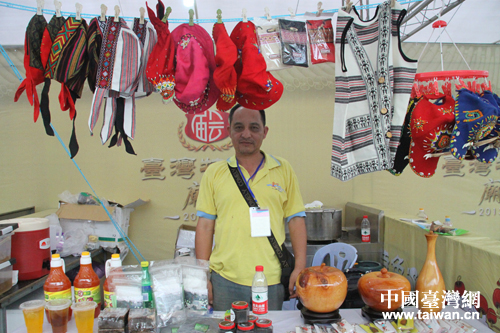 來自臺灣賽夏族的楊先生帶著臺灣原住民的服裝飾品以及原住民自制的特色飲品來到廟會現(xiàn)場。(中國臺灣網(wǎng) 孟雅詩 攝)