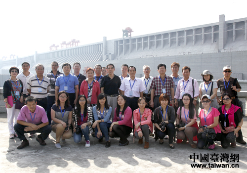 兩岸新媒體在三峽大壩前合影。(圖片來源:湖北省臺辦)