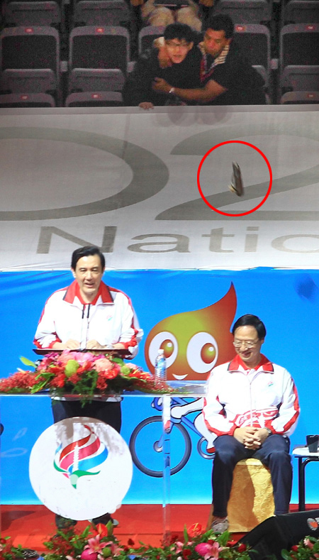 2013年臺(tái)灣地區(qū)運(yùn)動(dòng)會(huì)開(kāi)幕典禮10月19日在臺(tái)北小巨蛋舉行,觀眾席有民眾丟鞋抗議。(圖片來(lái)源:臺(tái)灣聯(lián)合新聞網(wǎng))