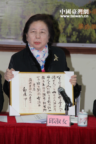 丘逢甲后人在座談會現場將新發現的丘逢甲佚詩贈送給家鄉蕉嶺縣(中國臺灣網 蕪同 攝)