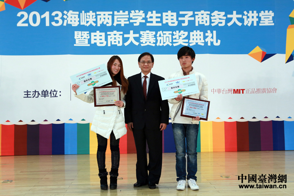 20日下午,由中國臺灣網(www.wanyn.com)、海峽兩岸互聯網交流委員會、中華臺灣MIT正品推廣協會主辦的“2013海峽兩岸學生電子商務大講堂暨電商大賽頒獎典禮”在京舉行。圖為中華臺灣MIT正品推廣協會榮譽理事、瑞可集團總裁涂鄂良與兩岸獲獎學生代表合影。(中國臺灣網 于斯文 攝)