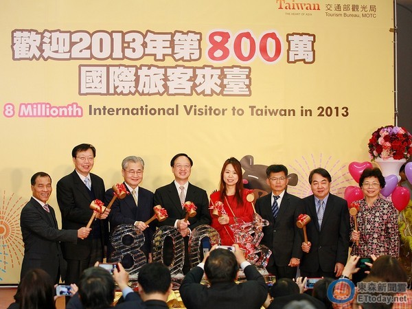 表彩(左5)成為2013年第800萬名赴臺旅客,獲得各界滿滿的祝福。(臺媒圖)