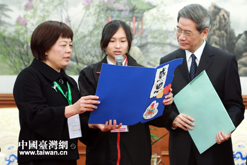 中國臺灣網1月10日北京消息 中共中央臺辦、國務院臺辦主任張志軍10日在北京會見了東莞臺商子弟學校葉宏燈董事長率領的畢業班學生“北京文化之旅”參訪團一行。