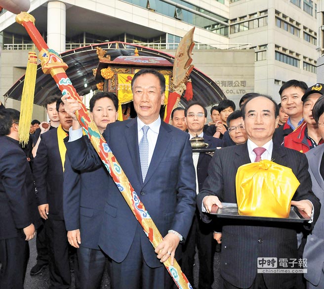 舉劍鍘內鬼,篤信關公的鴻海集團董事長郭臺銘,對收回扣弊案十分痛心,希望正義能伸張。圖為2013年郭臺銘(左)與臺“立法院長”王金平出席山西關公在臺繞境活動。(圖片來源:臺灣中時電子報)