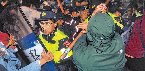 晚上約10時,“行政院”主建筑物大木門被拆下。苦守的警員見大勢已去,表情無奈,但仍試圖阻擋,爆發一波波推擠,混亂中多名警員和學生受傷,逾30人送醫。