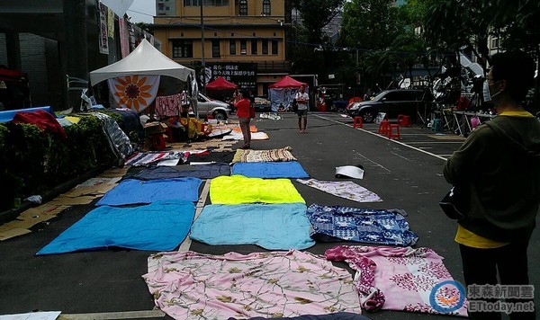 昨日,學生及民眾集結凱道反服貿,人潮從凱道蔓延至中山南路、濟南路、青島東路,反服貿學生團體總指揮林飛帆30日晚間號召大家排班守“立法院”,不過31日下午議場外群眾人數減少,“立法院”青島東路側停車場成為“曬被場”。