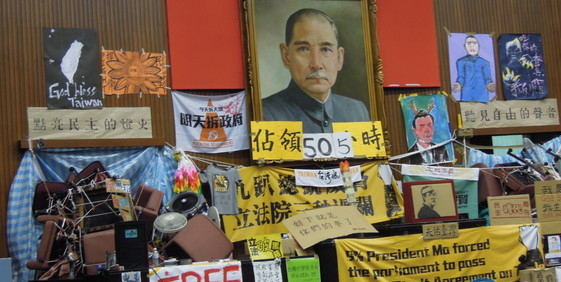 學(xué)生占據(jù)議場(chǎng)期間,主席臺(tái)上擺滿(mǎn)標(biāo)語(yǔ)旗幟。(臺(tái)媒圖)