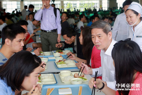 在顯得有些嘈雜的食堂里,張志軍與八、九個臺灣學生圍坐在一起,邊吃邊聊,聊學業,話家常。張志軍詢問同學們學習、生活情況,家住哪里,學什么專業,念幾年級,生活習不習慣,未來有什么打算。讀浙大財務管理專業的大三臺灣女同學徐育萱向張志軍介紹說,大一剛剛來的時候,學習、生活都不習慣,遇到困難,通過老師和大陸同學的幫助,現在已經完全適應這里的環境,自己也會幫助新來的臺灣同學盡快適應這里的節奏。她打算浙大畢業后繼續在大陸深造,報考北大研究生。