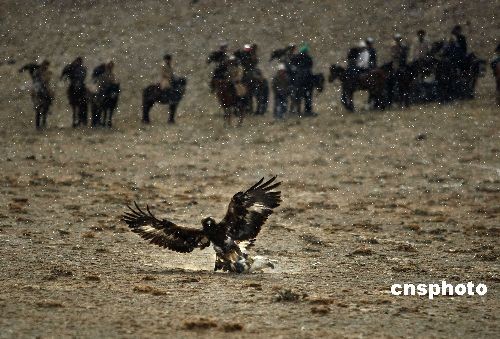 記者在獵鷹狩獵場看到,當(dāng)?shù)孛嫔嫌蝎C物野兔或者狐貍出現(xiàn)的時候,這些被馴養(yǎng)的獵鷹頭部的羽毛會立刻“怒發(fā)沖冠”,張開健碩的翅膀從馴鷹人的肩膀上或者手上飛向天空,盤旋著,尋找最佳的捕獵機(jī)會。當(dāng)一只狐貍或者野兔出現(xiàn)在它的視線中,獵鷹便加快盤旋的速度,尋找到機(jī)會后,便用近九十度的直角向下迅猛俯沖,兩只如同鋼構(gòu)一般的鷹爪死死的摁住獵物,等待它的主人前去捕獲獵物。