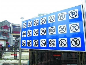 一名新浪網友在自己的博客中以《史上最牛禁令牌》為題記錄下他無意中在前門步行街發現的一景。“街頭竟有21道禁令牌,不許玩耍也罷,還不準吃喝,只剩安分守己、老老實實地走路了,真可謂史上最牛!”由于不少標識太過抽象,網友們紛紛根據禁令牌“看圖說話”,答案是五花八門。