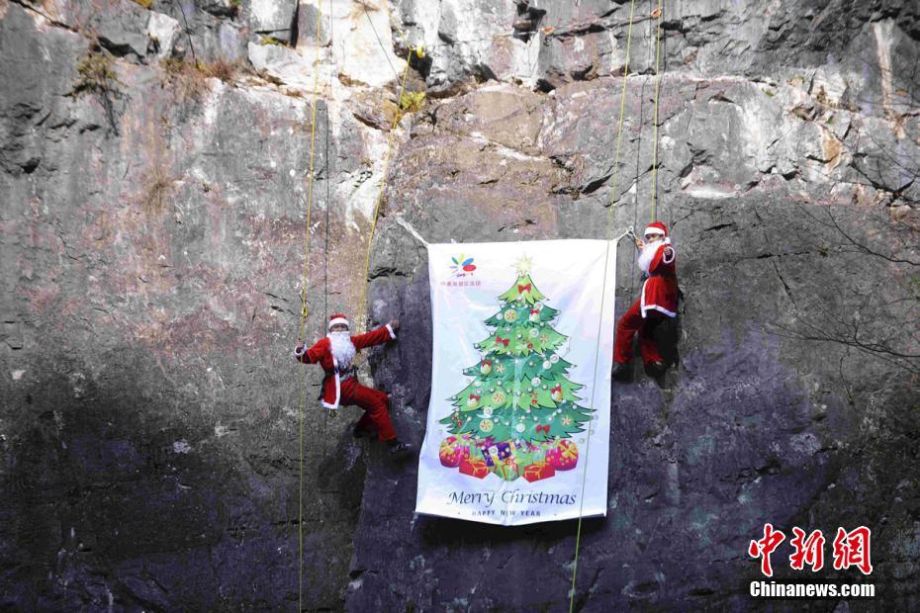 12月22日,正值圣誕節(jié)前夕,湖南湄江三道巖門的工作人員裝扮成圣誕老人爬上百米懸崖,在崖壁邊放上了禮品盒,并掛起了巨幅圣誕樹海報(bào),以此迎接即將到來(lái)的圣誕節(jié)。 楊華峰 攝