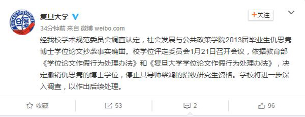 1月17日21時(shí)50分許,復(fù)旦大學(xué)官方微博就“抄襲門”發(fā)布回應(yīng):“關(guān)于媒體報(bào)道的我校社會(huì)發(fā)展與公共政策學(xué)院畢業(yè)生仇思雋涉嫌博士論文抄襲一事,我校學(xué)術(shù)規(guī)范委員會(huì)此前已接到相關(guān)舉報(bào)并啟動(dòng)了調(diào)查程序。目前,相關(guān)調(diào)查正在進(jìn)行中。如抄襲情況認(rèn)定屬實(shí),學(xué)校將依據(jù)《復(fù)旦大學(xué)學(xué)術(shù)規(guī)范實(shí)施條例》作出嚴(yán)肅處理。”