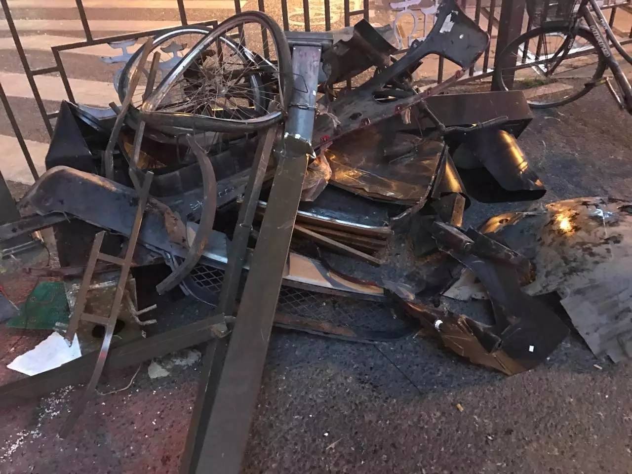 錢江晚報記者趕到現場時,受損車輛均已經被拉走,但是現場狼藉慘狀,依然能感受當時撞擊有多厲害。在現場,靠近中山北路和文暉路交叉口西南側一角,堆放著還沒處理的碎片,里面有變形的自行車,被撞斷的護欄鐵柱,車子上的各種配件。