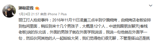 麗江打人搶劫事件:2016年11月11日凌晨三點半到寧蒗燒烤,由燒烤店老板安排到包間里面,稍后到來十幾個男孩子,大概是12個人,中途我跟朋友聊天(客棧老板)說的東北話,外面的男孩子就在外面學(xué)我說話,我說一句他就在外面學(xué)一句,然后伙同其他的人一起哈哈大笑,我們覺得他們很無聊,不管是搭訕還是挑釁的意思,我們沒有理會,繼續(xù)吃烤聊天,隔一會對方又開始學(xué)我們說話,這一次學(xué)完我們說話還辱罵我們,之后我們就問他什么意思,是不是喝多了酒,起初他們還沒有回復(fù),之后我們就各自吃烤肉了,其中有個穿藍色馬甲的中年男人,到我們我們間的門口打量我們包間,我們就不知道什么意思,我們還是繼續(xù)吃烤肉,之后他們就拿起酒瓶子進我們的包間,把酒瓶子砸到我們頭上,我們當(dāng)時就是暈的,之后我就被那三四個男人拉著頭發(fā)給拖到燒烤店的門口外面,一頓暴打,一邊錄視頻一邊打,之后覺得錄視頻的效果不好,又扯著我的頭發(fā)面朝天的樣子,繼續(xù)錄視頻暴打我,一邊打一邊還說:你不是東北人嚒?你不是很牛逼嗎?然后就哈哈大笑,把我打得滿臉都是血,還在拿碎掉的酒瓶子劃我的臉,之后他們?nèi)コ闊熜菹⒘耍谖伊餮倪^程,他們要求我按照他們說的話去說,不然就把我拖到山上去給埋了,威脅我的內(nèi)容是:小妹妹,你是不是自己從樓上掉下來摔成這樣的啊?要不要哥哥們幫你打120啊?要不要哥哥們救你啊?我們看你好可憐啊。我學(xué)著他們的話去說,這個過程他們是全程錄視頻的,反偵察的能力很強,說完之后就繼續(xù)打我,又了打了一頓,最后這次打完我,臨走之前有個狠狠地踢我一腳。我直接噴血了。這一腳我直接不行啦,上不來氣了,他們走之前丟給我手機,讓我自己打120 ,這是看我不行了,快死掉了,走的時候拿走我們身上帶的錢,錢包和手機,三個被打得人,只留了我這一部手機,還是看我不行了,給我打電話自救的,我們?nèi)齻人被足足打了半個小時,他們臨走之前還揚言說:他們就是當(dāng)?shù)厝恕⒉慌戮臁㈦S便告、還說在麗江在看到我、讓我有去無回....120是早上6:30左右來的,這期間我一直在流血,我打120的時候,我不知道燒烤店的名字,我問燒烤店的老板,他說完以后我就昏迷了,我們在這個燒烤店被打這么久,燒烤店的老板沒有報警和打120,就眼睜睜的看著我們被打,后來警方得知這個燒烤店和那其中的一個人是認識的,他們走的時候開著一輛白色的轎車走的。