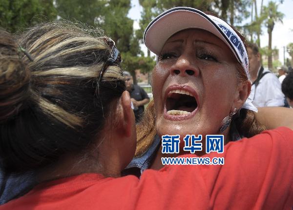 7月28日,在美國亞利桑那州州府菲尼克斯的首都博物館前,兩名婦女在得知法官的禁令后相擁而泣。當(dāng)日,美國聯(lián)邦地區(qū)法院法官在菲尼克斯宣布禁令,阻止亞利桑那州新移民法SB1070法案中最受爭議的四項條款生效。 新華社記者戚恒攝