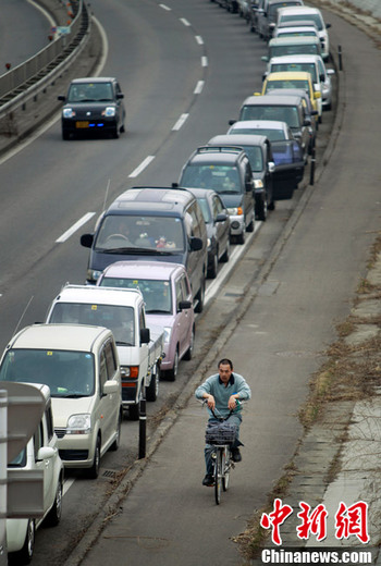 3月20日,日本福島縣高速路旁一加油站,等待購油的車輛排起了長長的隊伍。