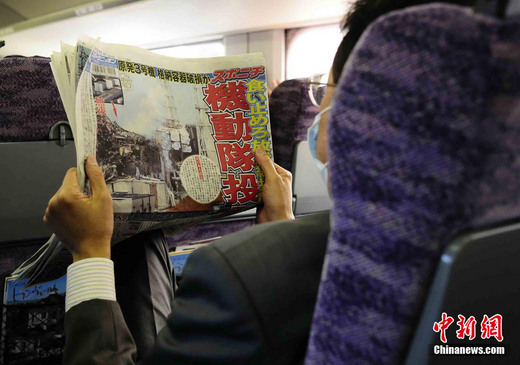 3月17日下午,在一列前往東京的新干線列車上,一名日本人在閱讀關(guān)于福島核電站三號機組最新狀況的報道。中新社發(fā) 侯宇 攝