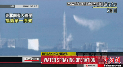 日本防衛(wèi)省17日表示,陸上自衛(wèi)隊的兩架直升機已開始向福島第一核電站三號機組注水。據(jù)NHK電視臺報道,當?shù)貢r間17日上午11時01分左右,自衛(wèi)隊兩架直升機開始對第一核電站三號機組開始注水作業(yè)。這樣的注水作業(yè)據(jù)信已進行了至少四次。圖為直升機向福島第一核電站三號機組注水過程的電視截圖。