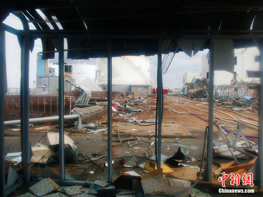 日本原子能安全保安院2011年3月23日發(fā)布的照片顯示了福島第一核電站內(nèi)部建筑物受損情況。圖為福島第一核電站1號反應(yīng)堆控制室。
