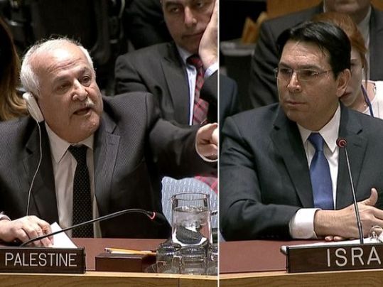 安理會當天舉行中東問題會議,以色列常駐聯合國代表丹尼·達農與巴勒斯坦常駐聯合國觀察員里亞德·曼蘇爾在會上火力全開,互不相讓。
