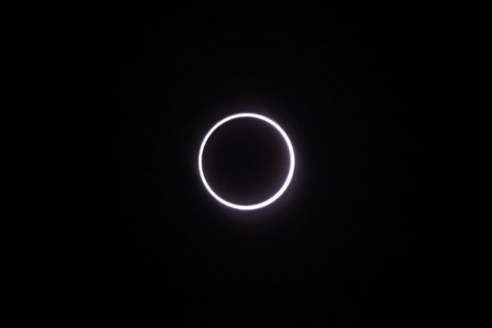 在日食達到高峰時,地球、月球和太陽的位置幾乎成一直線,明亮的太陽被黑色月球陰影遮住,只露出周圍一圈亮光。