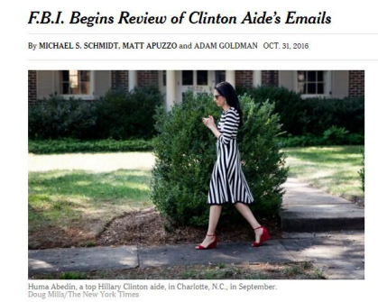 FBI開始篩查希拉里助手電郵。圖為今年9月,希拉里助手胡瑪·阿伯丁在北卡羅萊納州夏洛特。紐約時報網站截圖