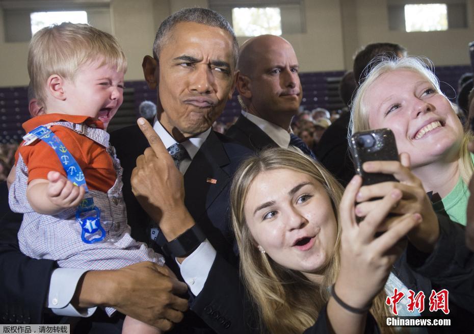 當(dāng)?shù)貢r間2016年11月1日,美國俄亥俄州,總統(tǒng)奧巴馬舉行集會演講,為民主黨總統(tǒng)候選人希拉里拉票,F(xiàn)場的一名小朋友吸引了奧巴馬的注意,他再次展示了自己對于孩子的親和力,抱著萌娃嘟嘴和現(xiàn)場民眾合影,只是這名寶寶并不是太開心,在總統(tǒng)懷里放聲大哭。