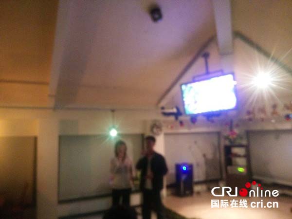 在金剛山旅游時,當?shù)氐牟蛷d里師生聚餐,屏幕對面是餐桌