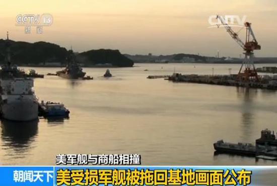 原標(biāo)題:美軍艦與商船相撞:美受損軍艦被拖回基地畫面公布