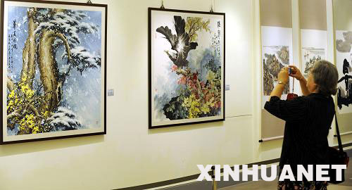 當(dāng)日,2009當(dāng)代國(guó)畫名家作品展在臺(tái)北市開幕,展出兩岸國(guó)畫名家作品140幅。中國(guó)國(guó)民黨主席吳伯雄與來(lái)自大陸的中國(guó)美術(shù)家協(xié)會(huì)主席劉大為等為畫展剪彩揭幕。新華社發(fā)(吳景騰 攝)