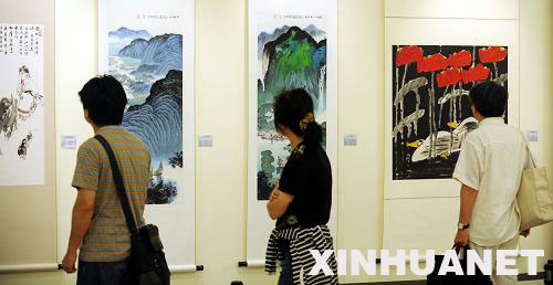 6月6日,2009當(dāng)代國(guó)畫名家作品展在臺(tái)北市開幕,展出兩岸國(guó)畫名家作品140幅。中國(guó)國(guó)民黨主席吳伯雄與來(lái)自大陸的中國(guó)美術(shù)家協(xié)會(huì)主席劉大為等為畫展剪彩揭幕。這是參觀者在觀看畫展。新華社發(fā)(吳景騰 攝)