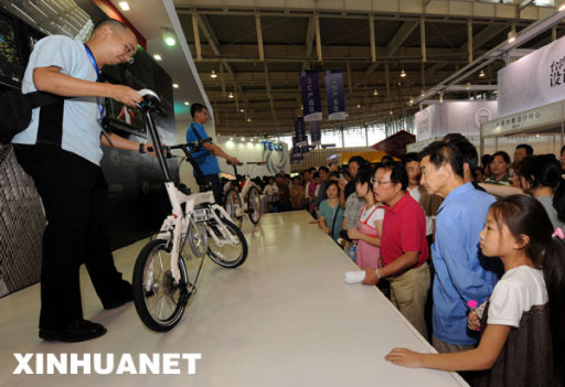 9月19日,臺灣技術(shù)人員在向南京市民展示可于15秒鐘內(nèi)折疊完畢的輕便自行車。