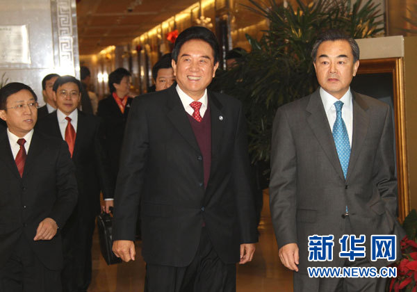 12月20日,海協會會長陳云林率海協會協商代表團離京赴臺,參加21日在臺北舉行的兩會領導人第六次會談。中共中央臺辦、國務院臺辦主任王毅在北京首都國際機場為陳云林送行。新華社記者汪永基攝