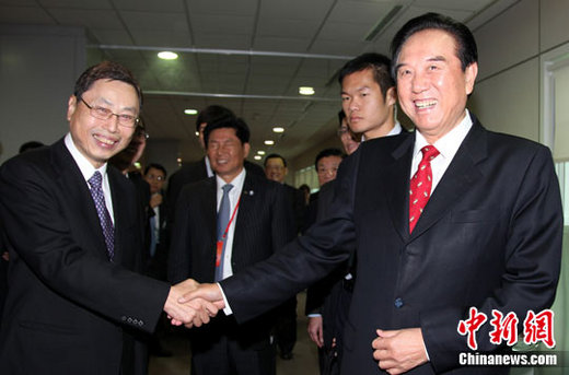 2月28日上午,海協(xié)會會長陳云林一行圓滿結(jié)束6天的首次經(jīng)貿(mào)之旅,搭乘中華航空公司班機(jī)離臺。圖為登機(jī)前,陳云林與前往桃園機(jī)場送行的海基會副董事長高孔廉握手道別。中新社發(fā) 董會峰 攝