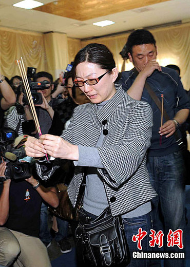 首批阿里山小火車意外事件死者家屬,29日早上到殯儀館認尸。徐熙芬家屬難掩內心哀傷激動痛哭,在靈堂上香。中新社發(fā) 譚達明 攝