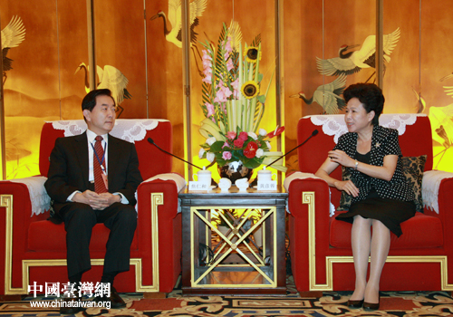 11日,“情系巴蜀——兩岸文化聯誼行”活動在成都開幕。圖為四川省副省長黃彥蓉會見前海基會副董事長焦仁和。(中國臺灣網 趙輝 攝)