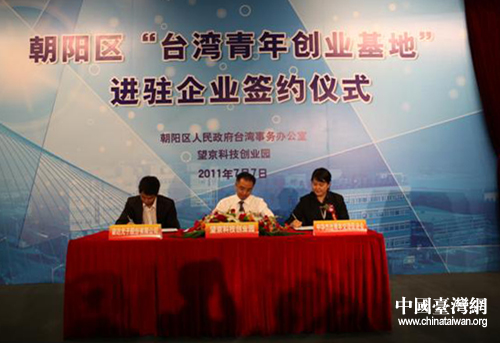 北京市朝陽區“臺灣青年創業基地”首批進駐企業簽約儀式現場(圖片來源:北京市朝陽區臺辦)