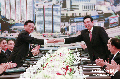 20日上午9時,兩岸兩會領導人第七次會談在天津迎賓館舉行,圖為海協會會長陳云林與臺灣海基會董事長江丙坤握手致意。(中國臺灣網 陳佳慧 攝)