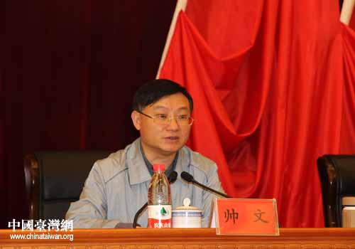 帥文充分肯定去年全市對臺工作,他指出,2011年,全市各級各部門和對臺工作系統認真貫徹中央對臺工作方針政策,推動對臺工作不斷創新發展,如成功舉辦“筑臺兩地中醫藥文化研討暨項目推介會”、“在臺筑籍新娘爽爽貴陽行”和“筑臺兩地書畫藝術交流展”等大型涉臺交流活動,完成《從陽明文化看筑臺情緣》專題片的拍攝和“貴陽市小河經濟技術開發區系列報道”工作,為推動兩岸關系和平發展作出了積極貢獻。