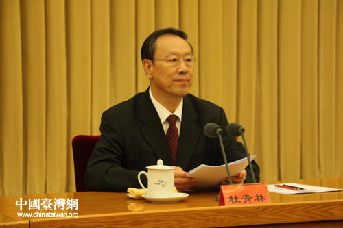 全國政協(xié)副主席、中共中央統(tǒng)戰(zhàn)部部長、中國和平統(tǒng)一促進(jìn)會(huì)執(zhí)行副會(huì)長杜青林在會(huì)議上做了題為《深化和平發(fā)展 著力爭取民心 促進(jìn)祖國統(tǒng)一》的工作報(bào)告。(中國臺(tái)灣網(wǎng) 王君飛 攝)