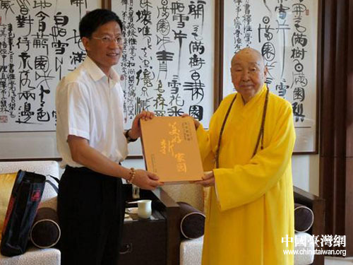 中國(guó)臺(tái)灣網(wǎng)6月26日南投消息 日前,在臺(tái)灣參訪的四川省委常委、副省長(zhǎng)鐘勉前往臺(tái)灣中臺(tái)禪寺拜會(huì)了祖籍四川的惟覺(jué)大師,與惟覺(jué)大師互敘鄉(xiāng)情。