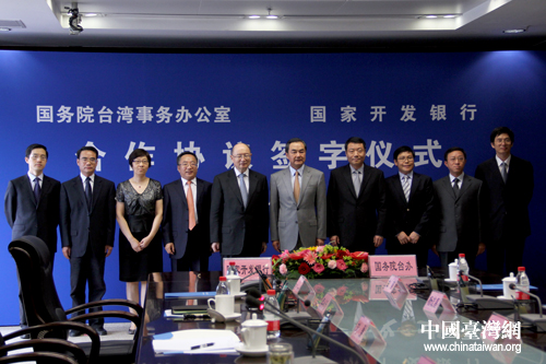 國(guó)臺(tái)辦與國(guó)家開(kāi)發(fā)銀行18日在北京再度簽署合作協(xié)議,將在支持大陸臺(tái)資企業(yè)發(fā)展和陸資赴臺(tái)等領(lǐng)域通力合作,促進(jìn)兩岸經(jīng)濟(jì)共同發(fā)展。圖為雙方完成簽字儀式后合影。(中國(guó)臺(tái)灣網(wǎng) 普燕 攝)