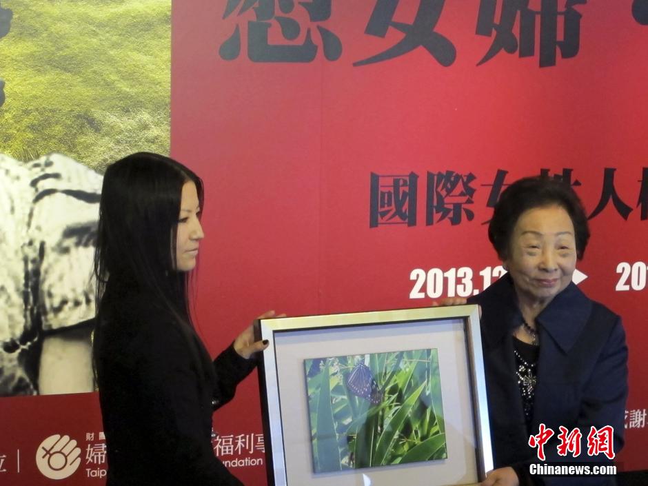 12月9日,臺灣婦女救援基金會邀請由韓裔美籍藝術家李昌珍女士策劃的“慰安婦招募”展覽在臺北展出。該展由李昌珍女士自2008年起前往中國大陸、臺灣、韓國等地,收集大量慰安婦史料,并以多媒體視頻、仿公告海報、模擬重建慰安所等形態展出。圖為臺灣慰安婦代表、年逾90的陳蓮花阿嬤(右)向李昌珍贈送自己的攝影作品。中新社發 葉小剛 攝